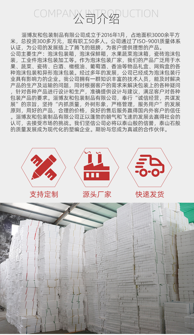????淄博友和包裝制品有限公司是專業的山東泡沫包裝箱加工廠家,本廠主要產品有:泡沫包裝箱,泡沫保鮮箱,水果蔬菜泡沫包裝箱,水果蔬菜泡沫保鮮箱,瓷磚泡沫包裝箱等,產品暢銷全國,深受用戶好評。泡沫包裝定做可以聯系我們網站 http://m.sdlsst.com/ 上電話,我們會第一時間跟您聯系。